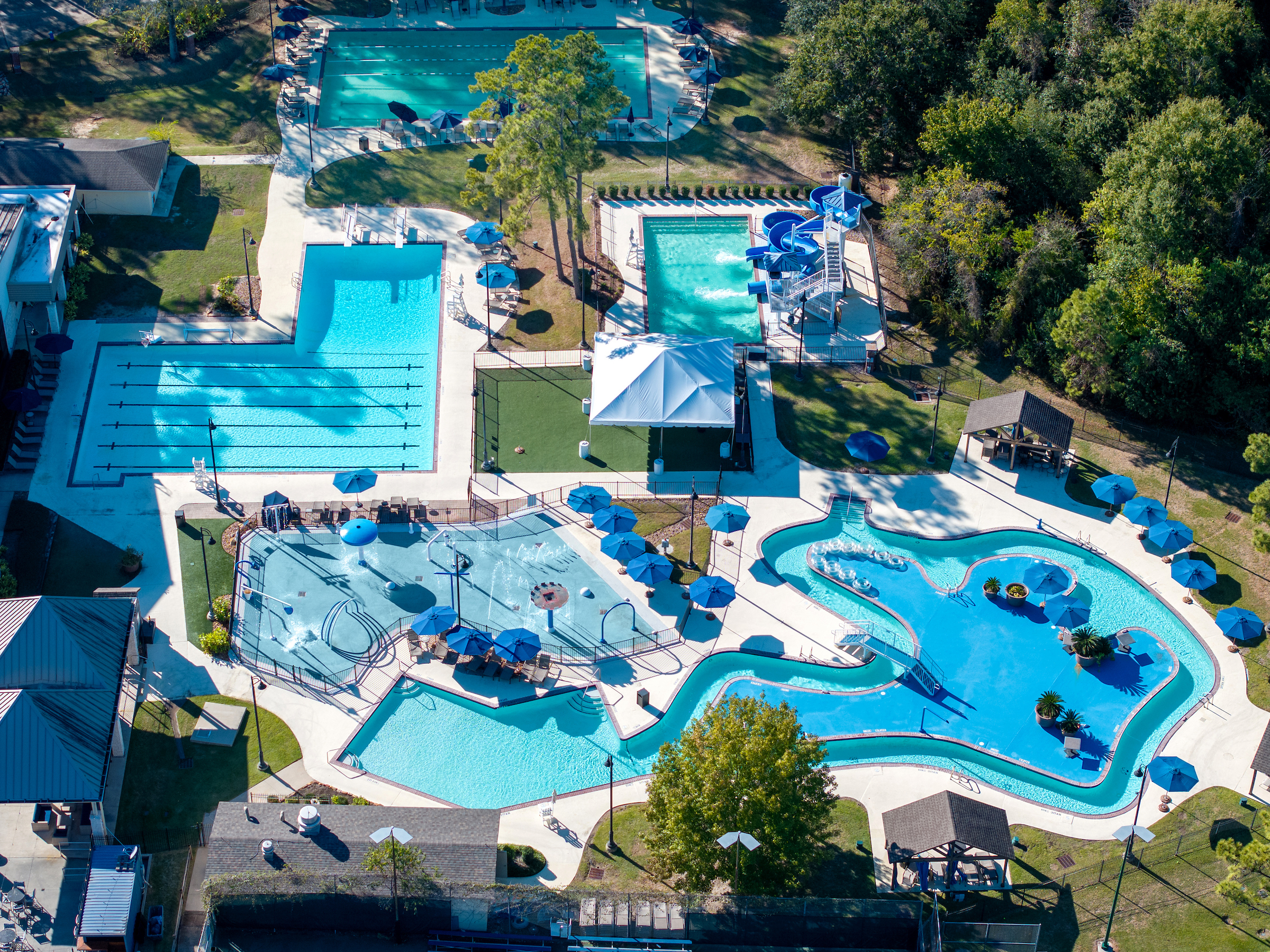 Resort-style aquatics, featuring pools and lounge areas for recreation and family enjoyment.